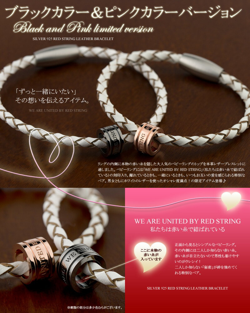 男性用はブラックロジウムコーティングでシックに、女性用はピンクゴールドコーティングで可愛くキュート!ベビーリングには「WE ARE UNITED BY RED STRING」(私たちは赤い糸で結ばれている)の刻印入り。
